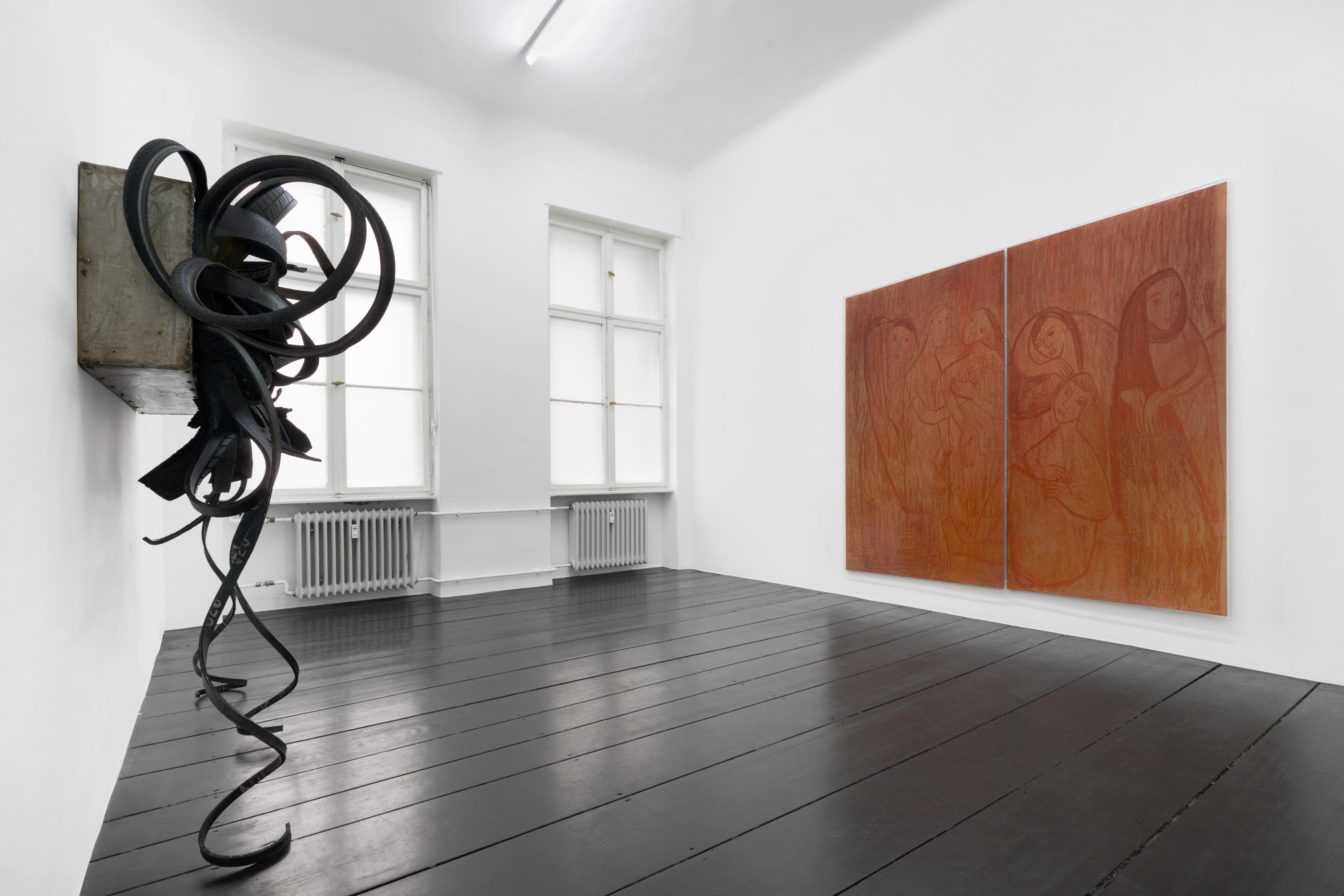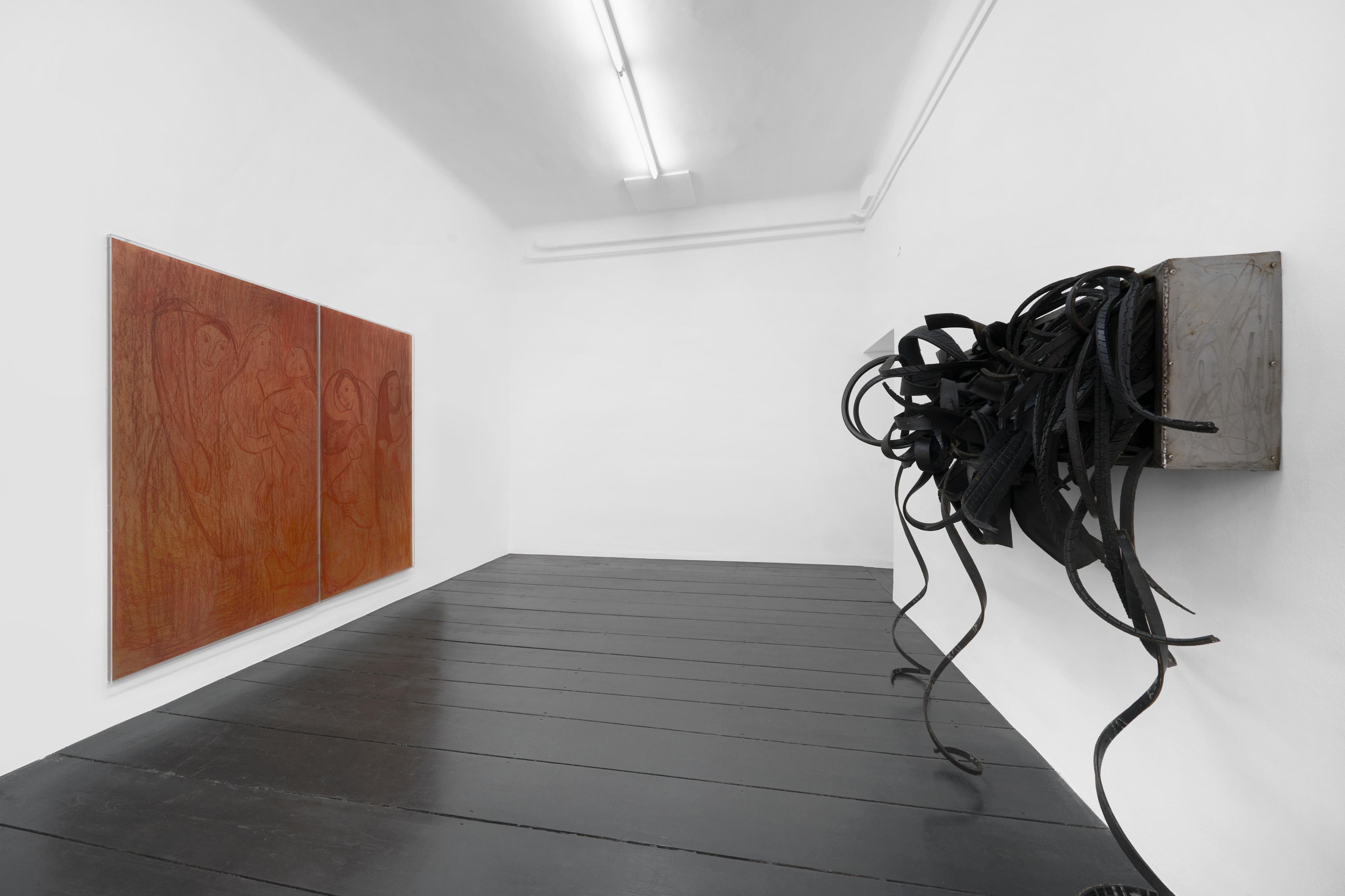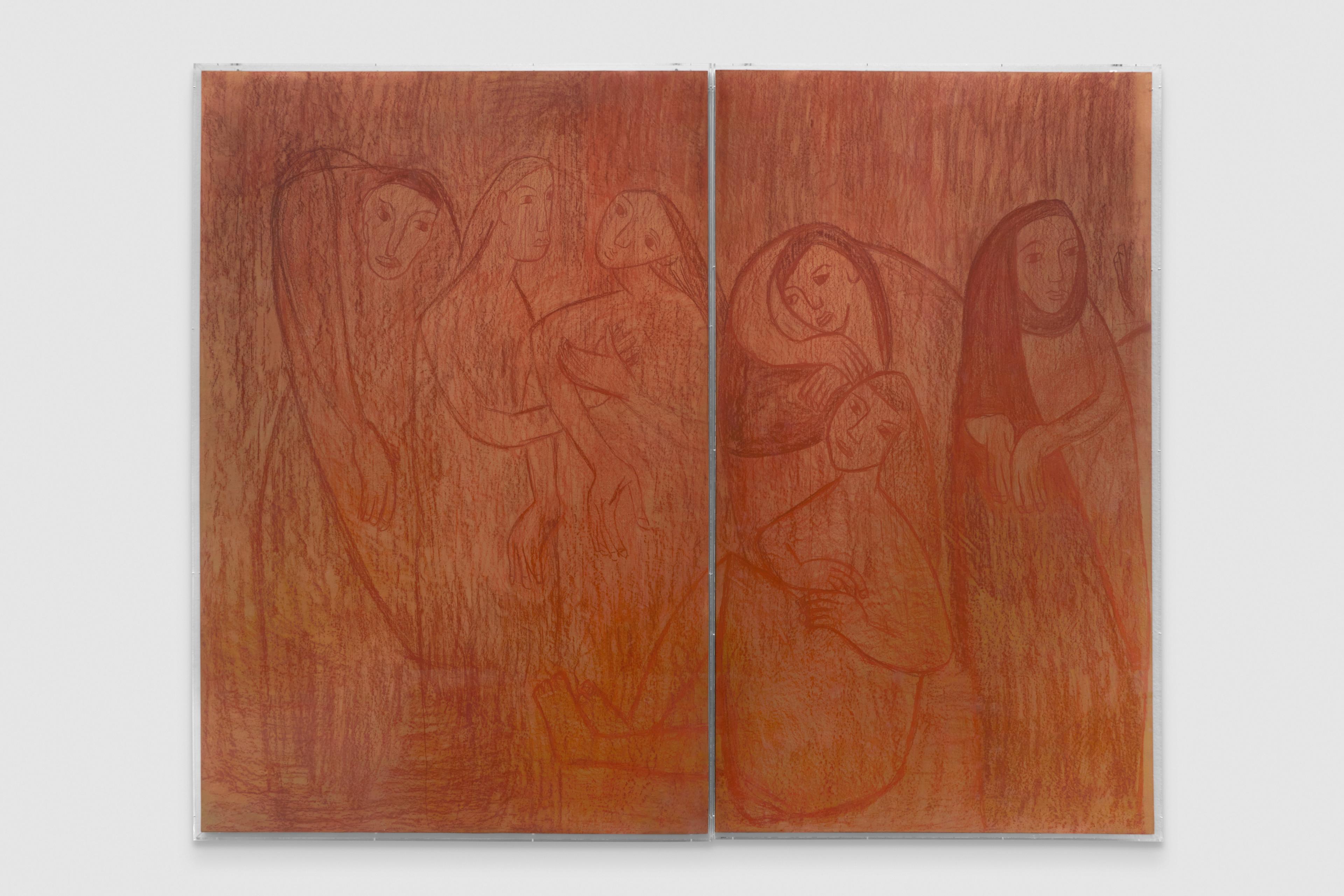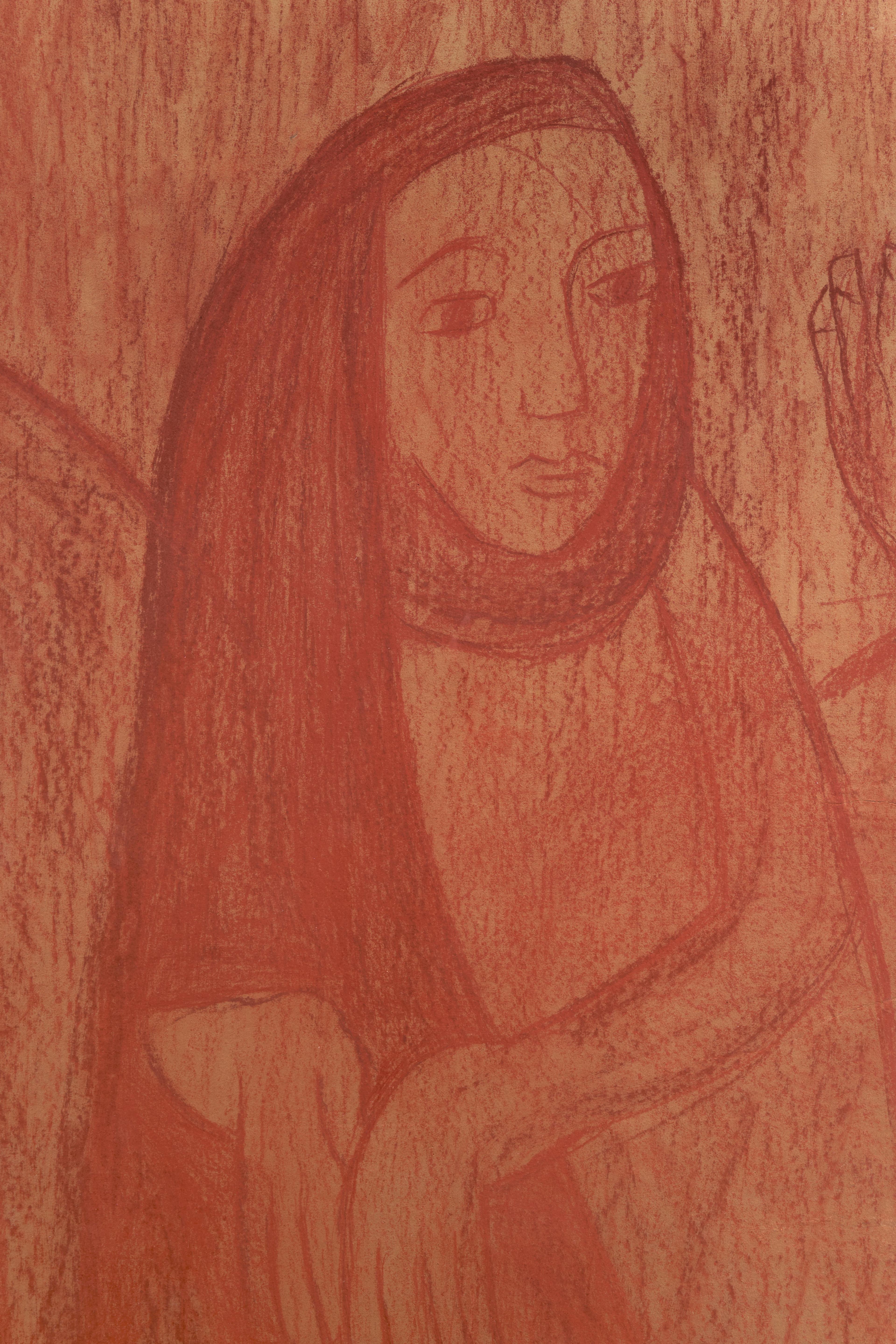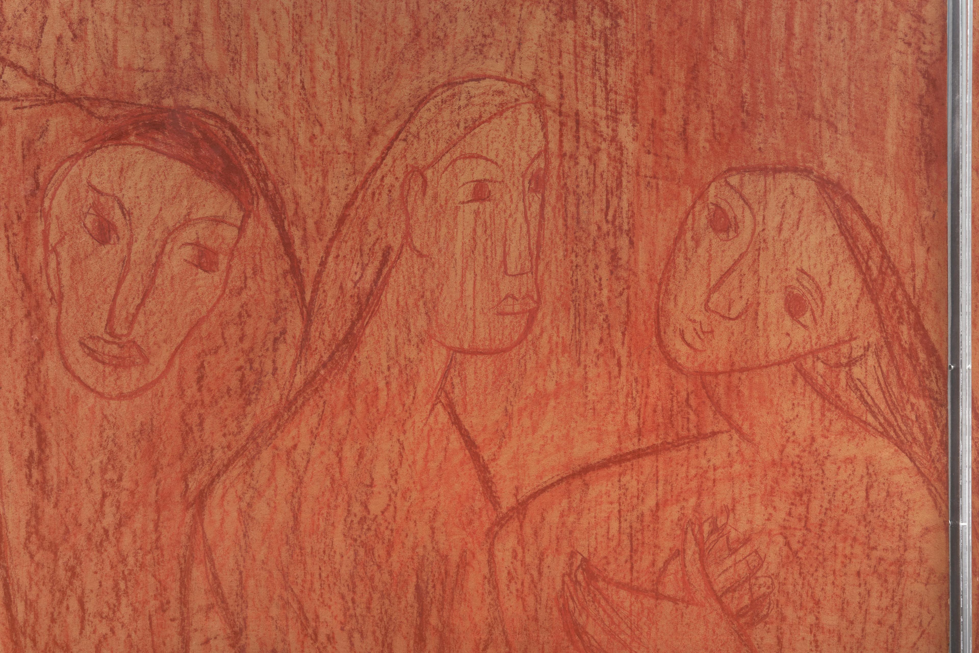 Sanguine (reddish-brown chalk) on paper, mounted on wooden board 2 framed panels, side by side